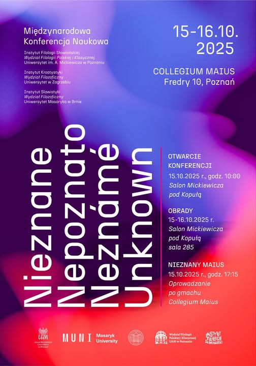 W dniach 15–16 października 2025 na naszym Wydziale odbędzie Międzynarodowa Konferencja Naukowa „Nieznane-Nepoznato-Neznámé-Unknown„, poświęcona nieznanemu w literaturze, języku, sztuce, kulturze i społeczeństwie. Serdecznie zapraszamy do udziału!