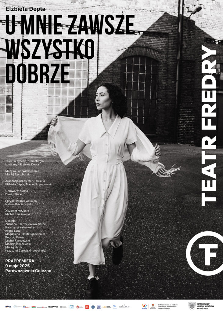 W imieniu Dyrekcji i Zespołu Teatru im. A. Fredry w Gnieźnie mamy przyjemność poinformować, że teatr przy współpracy z gnieźnieńskim stowarzyszeniem Stara Parowozownia przygotował polską prapremierę sztuki „U mnie zawsze wszystko dobrze” autorstwa i w reżyserii Elżbiety Depty. To performatywna inscenizacja dramatu powstałego w ramach stypendium MKiDN, opowiadającego opartą na faktach historię niemożliwej miłości Żydówki Mali Zimetbaum i Polaka Edwarda Galińskiego. Ich brawurowa ucieczka z Obozu Zagłady Auschwitz Birkenau nie udałaby się bez pomocy esesmana Edwarda Lubuscha. To opowieść o poszukiwaniu sensu życia w anus mundi, odbycie świata, podejmowaniu bezkompromisowych decyzji i ich konsekwencjach.